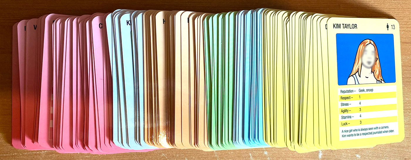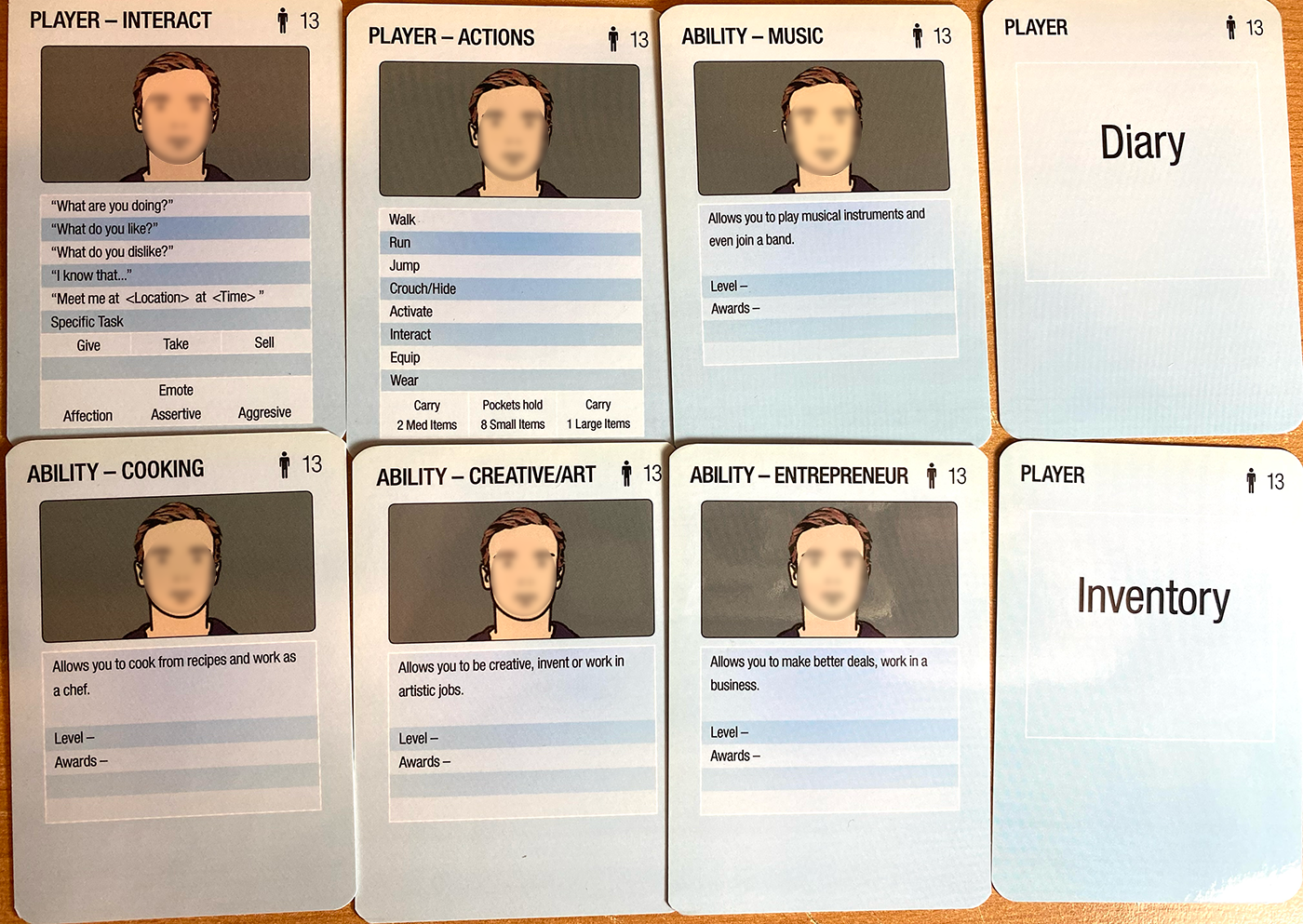 In order to prototype the complex narrative structures, Jason devised a low cost playable vertical slice demonstration in the form of a systemic card game version of one of the life chapters. Each interlinking narrative thread, RPG systems, character interaction, location and objects could be play tested within the design group and then further revised by play testing the game with a revolving set of guest players.